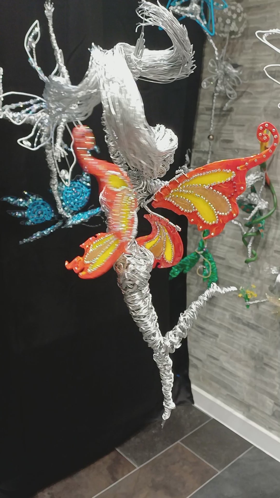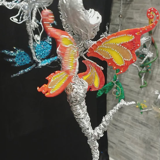 A Beautiful 19 inch red and yellow winged fairy with gems on her wings....